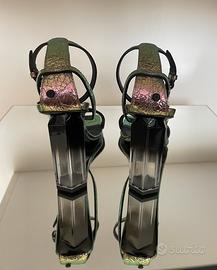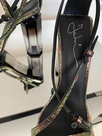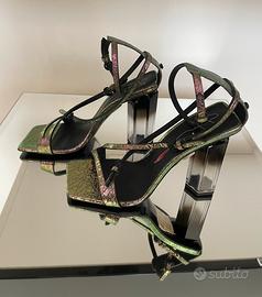 Finitura metallizzata: Una particolare stampa effetto pitone in tonalità verde petrolio e viola cangiante. Design a listini: Caratterizzati da cinturini sottili incrociati sul davanti e chiusura con fibbie. Tacco a stiletto: 10,5 cm abbinato a una punta squadrata