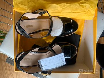 Zeppe Fendi in pelle di vitello nero lucida con suola in cuoio.
