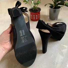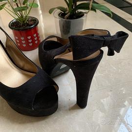 Vendo platform Forever21 effetto suede nere, tacco 13 piuttosto largo e solido e generoso plateau anteriore di 3,5 cm. Punta aperta, presentano un fiocchetto sul laccio posteriore. Numero 40, ma hanno la pianta piuttosto larga e vestono tranquillamente un 40,5/41.