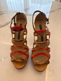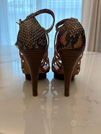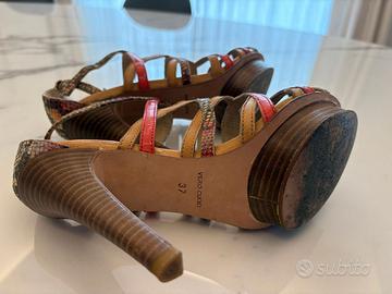 Splendidi sandali con tacco alto e plateau del prestigioso brand italiano Franco Morichetti. Una calzatura di altissima qualità, realizzata artigianalmente con materiali pregiati. Dettagli del design: Materiale: Vera pelle di alta qualità con inserti in stampa pitonata multicolore e dettagli in vernice rosso corallo. Tacco: Stiletto slanciato da 8 cm con effetto legno venato. Comfort: Presente un comodo plateau anteriore (2 cm) che attenua l'altezza del tacco, rendendo la calzata più stabile. Suola: In Vero Cuoio (come certificato dall'incisione sotto la suola). Chiusura: Cinturino alla caviglia con fibbia regolabile color ottone antico. Stato del prodotto: Le scarpe sono in buone condizioni generali. La tomaia, i cinturini e il tacco sono ben conservati. Segnalo normali segni di utilizzo sulla suola in cuoio e sulla parte anteriore del plateau (visibili in foto), che non pregiudicano l'estetica una volta indossate. Misura: 37 Brand: Franco Morichetti Stile: Glamour / Animalier / Etnico Perfette per l'estate, per cerimonie o serate speciali dove si vuole risaltare con un accessorio unico e Made in Italy. Spedizione veloce e curata. Disponibile per ogni info!