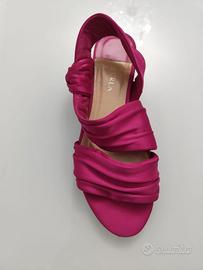 Sandali usati ma in buono stato. Suola in cuoio rinforzata. piccolo difetto come da foto tra la suola e l'attaccatura del raso ma non si nota e non compromette la funzionalità