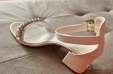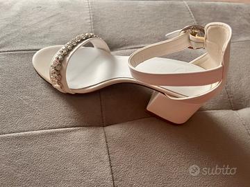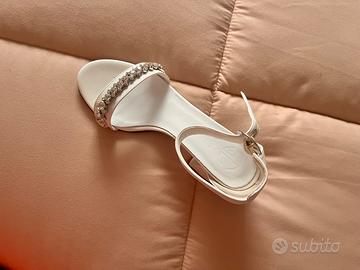 Vendo eleganti sandali gioiello artigianali, colore bianco, impreziositi da dettagli luminosi sulla fascia frontale. Tacco comodo da 5,5 cm.