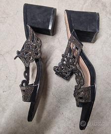 Splendidi sandali neri scamosciati con tacco a blocco comodo, ideali per cerimonie, serate o eventi eleganti. Il design è impreziosito da un motivo floreale interamente ricoperto di strass luminosi.