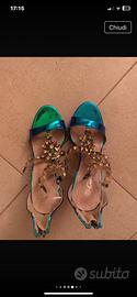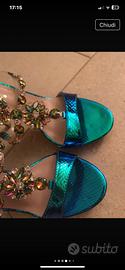 Sandali gioiello, color verde, azzurro metallizzato, tacco 11 cm nuovi, mai usati provati solamente a casa. Chiusura con zip sul tallone.
