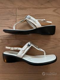 Vendo bellissimi sandali infradito gioiello GEOX, nr.39, lunghezza 25 cm (da tabelle Geox), tacco 4 cm. NUOVI, MAI USATI come da foto (regalo errato finito nel “dimenticatoio”). Pelle, colore bianco. Sprovvisto di scatola.