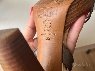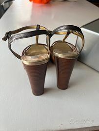 Sandali gioiello n. 35, in pelle con cinturino alla caviglia, tacco cm 11,5, suola in legno. Usati ma in buono stato.