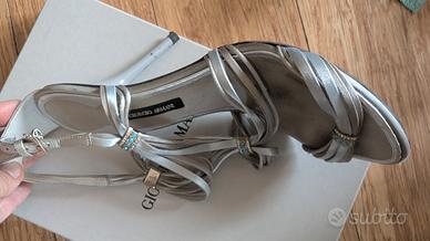Sandali Giorgio Armani sera grigio perla con inseriti gioielli turchesi e oro da collezione/sfilata. Tacco 10. Usati diverse volte perché molto comodi ma ancora in buono stato.