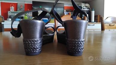 Vendo sandali grigio eleganti da donna, numero 36. Non presentano segni di usura, eccetto la mancanza di un piccolo brillantino sul sandalo destro.