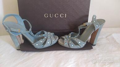 Colore acqua marina, scamosciato. Cristalli blu che sotto la luce intensa riflettono la luce. Made in Italy. Cinturini a T con hardware dorati con la scritta Gucci. Più che ottime condizioni. Presente scatola originale e dust bug. Prezzo di listino 800 euro. Taglia 36,5 IT. Scatola originale e dustbug. Comode perché hanno il tacco largo e la pianta larga.