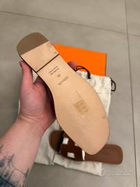 Eleganti sandali Hermès modello Oran in pelle marrone con iconico intaglio “H”, perfetti per l’estate. Condizioni pari al nuovo.