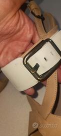 Sandali BOSS di HUGO BOSS tg 39 in pelle e cuoio. Lavorazione al intreccio sul davanti, regolabili, chiusura con la fibbia, colori pastello beghe e panna. Ottima aderenza al piede.
