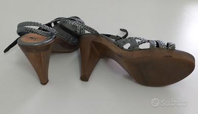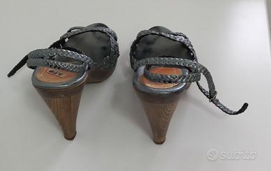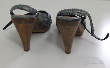 Sandalo in struttura e tacco in legno, con cinturino in pelle intrecciata doppio giro alla caviglia misura 36,5, plateau cm 1,5 e tacco cm 9,5. Il sandalo è in perfette condizioni, presenta una leggera ombra in corrispondenza dell’alluce.