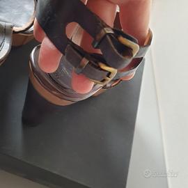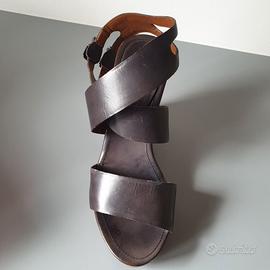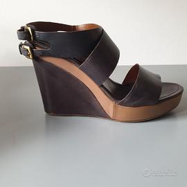 Portati poche volte. Hanno però delle "sbucciature" nella pelle del tacco, sul retro (vedi foto). Il resto dei sandali non ha difetti. Pelle morbida, di colore blu scuro (di sera sembrano neri). La zeppa ha motivo bicolore beige. Hanno cinturino alla caviglia che si incrocia dietro, avvolgendo il piede, e si chiude con doppia fibbia. Altezza zeppa cm 10 - altezza plateau cm 2 Vestono un 37 o un 38, Li spedisco con scatola originale.