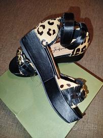 Vendo sandali con zeppa in raso nero e cavallino maculato n 39 Per sbaglio numero, messi una sola volta