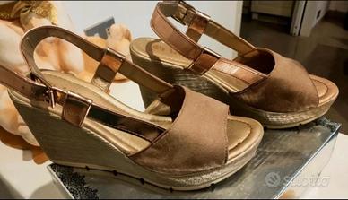 Zeppa Inblu comoda e stabile modello Kell, fascia larga anteriore marrone, la suola interna e il cinturino alla caviglia sono con dettagli in tonalità dorata, tomaia in scamosciato (effetto daino) e sottopiede imbottito in pelle soft per un maggiore comfort.