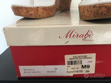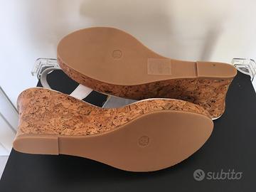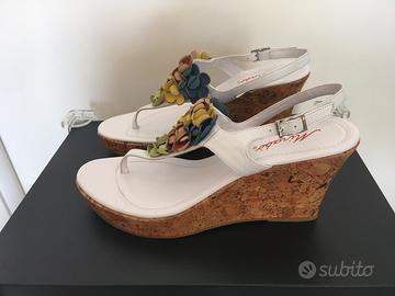 Vendo sandali in pelle bianchi infradito, con fiori colorati. Zeppa in sughero. Nuovi mai usati, presentano qualche macchia sulla pelle del retro dei fiori. Taglia 39.