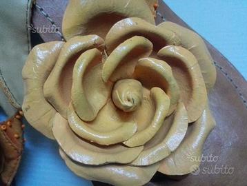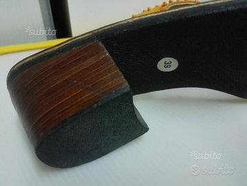 In condizioni più che buone, per inutilizzo vendo delicati sandali infradito in cuoio fatti a mano con motivo floreale, anch'esso tutto in cuoio, di colore arancio chiaro.