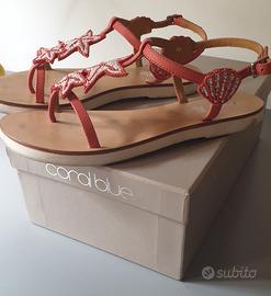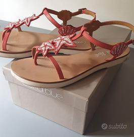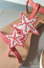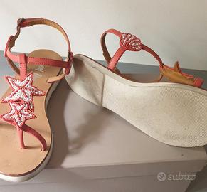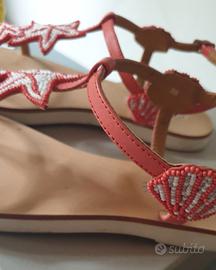 Indossati pochissimo, non hanno difetti. In pelle di colore rosso chiaro con stelle marine sul davanti e conchiglie sulla caviglia, realizzate in perline rosse e bianche. I sandali sono in pelle, con suola in gomma. Li fornisco con la scatola originale.