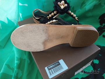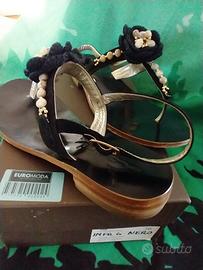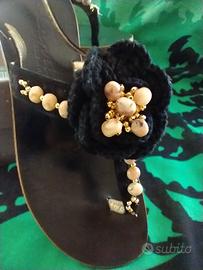 Sandali in camoscio e cuoio con perline e fiore in tessuto tacco rinforzato cm 2, tg 36 Capri
