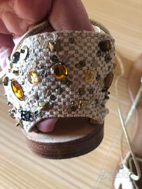 Sandali infradito bassi nr. 37 con ricamo pietre e paillettes al tallone e laccetti alle caviglie.
