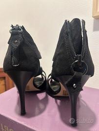 Vendo sandali neri con motivo di intreccio sulla tomaia, effetto scamosciato, come da foto. Numero 38. Piccola zip dietro.