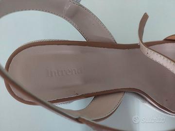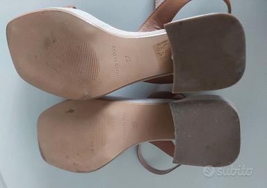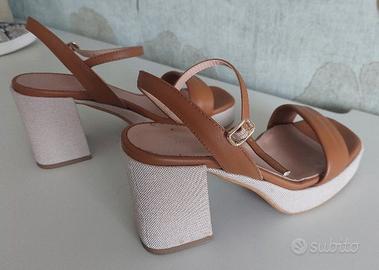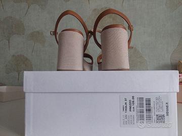 Sandali taglia 37 color cuoio. In vera pelle e suola in cuoio. Tacco rivestito in stoffa color corda e rifiniture in pelle. Praticamente nuovi come si può vedere dalla foto delle suole. Con scatola originale.