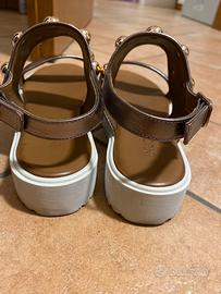 Vendo per inutilizzo aandali donna Inuovo in pellw colore bronzo e borchie applicate colore in tono bronzo. Cinturino regolabile. Suola uniforme bianca alta cm.3 sul tallone acemde leggermente a cm 2,5. Euro 40. Se serve spedizione accordarsi.