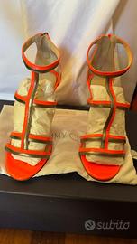 Sandali in pelle trattata in vernice neon arancione e pelle metallizzata in bronzo tacco 100 mm Prezzo nuovo 720€ Usate un paio di volte