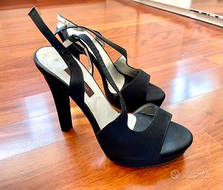 Sandali con tacco neri in raso, L’amour by Albano. Numero 37. Tacco 12,5 cm. Plateau 2 cm.