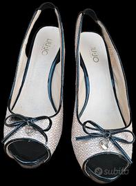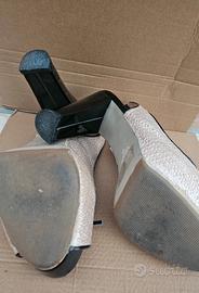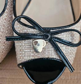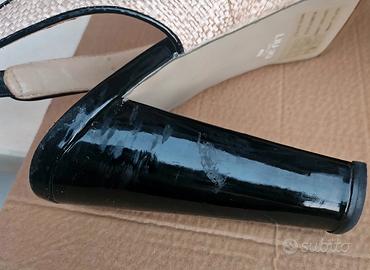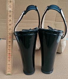 sandali in tessuto ecru e tacchi in vernice nera. in buonissime condizioni. segni di usura nei tacchi ( visibile in foto )ma facilmente ritoccabili con apposita vernice nera. .Tacchi alti 11,5 cm ma rimangono molto comode. Ideali per chi vuol acquistare cm sotto ad un vestito lungo o a pantaloni palazzo. tg 39