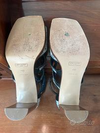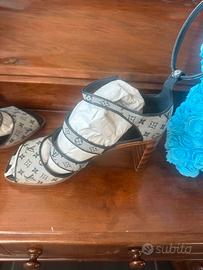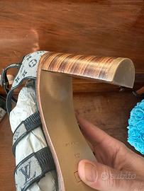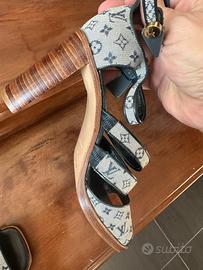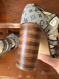 I sandali Louis Vuitton, caratterizzati dall'iconica tela Monogram Mini in blu navy e da un tacco alto in legno. Questo design a più cinturini è stato realizzato durante l'era di Marc Jacobs per la maison e presenta dettagli in pelle abbinata e una chiusura con fibbia dorata alla caviglia. Dettagli del prodotto Materiale: Tela Monogram Mini e finiture in pelle. Tacco: Legno massello con altezza di circa 7,5-8 cm. Caratteristiche: Design con cinturini multipli e soletta nera con logo Louis Vuitton dorato. Usati solo UNA VOLTA Misura 41 e mezzo