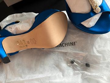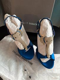 Vendo Sandali gioiello, marca Luciano Barachini, colore bluette raso con strass a forma di elefante, come da immagini. Numero 38, tacco alto sottile misura 12, allacciato al tallone, vero cuoio, completi di ricambio tappino tacco. Mai usate! Non spedisco. Collezione 2012, linea indossata dalle ragazze di Miss Italia.