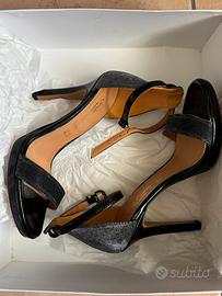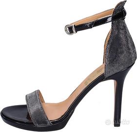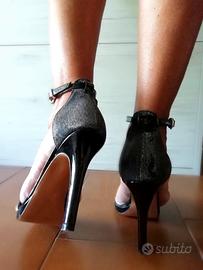 Presenta fascia sottile sul davanti e tallone chiuso entrambi in lurex nero argentato, sottile cinturino alto alla caviglia con chiusura fibbia regolabile, plantare in vera pelle