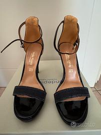 con un tacco lucido a spillo alto 10 cm e un leggero plateau davanti effetto vernice alto 2 cm