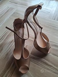 Bellissimi sandali in pelle lucida color oro, marca INTREND (gruppo MaxMara) mod. originale. Le scarpe, n°40, non sono state mai state usate (vedi i tacchi e la suola che ha ancora la pellicola in plastica) e pertanto sono nuove. L'altezza totale del tacco è circa 10 cm. compreso il plateau di circa 1,5 cm..