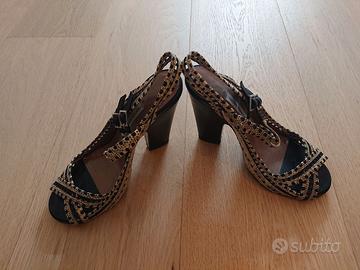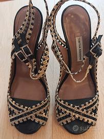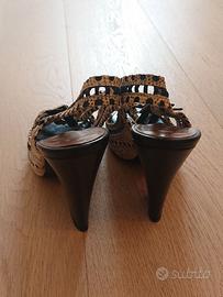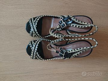 Sandalo originale Tabitha Simmons con zeppa 12cm e plateau 2cm, il tacco dietro è sottile. In pelle di rettile praticamente nuovo, molto ben rifinito nei dettagli, no difetti. Doppio cinturino sulla caviglia. veste 36,5/37 a seconda della pianta del piede. Colore marrone scuro e beige ma abbinabile anche con il nero.