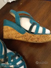 sandali da donna con motivo intrecciato colore verde/blu portati poco comodi