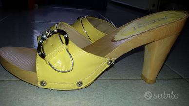 Vendo a 15 euro zoccoletti gialli in ottimo stato, causa inutilizzo. Misura 38, altezza tacco 10 cm. Usate solo una volta Dotate di scatola originale, come visibile in fotografia. È già presente una foto coi sandali indossati. Gentilmente smettete di scrivermi per chiederne altre, senza un reale interesse per l'articolo. Non verrà assecondata alcuna "fantasia".