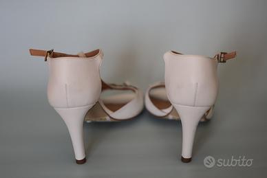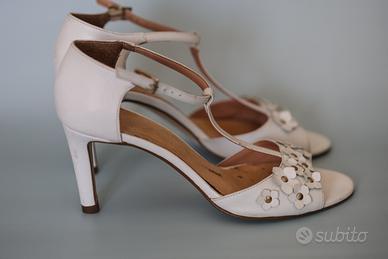 sandali misura 38, usati. Sandali bianchi, con tacco, con applicazioni di fiori sul décolleté. Cinturino. Ideali per eventi come cerimonie, comunioni, matrimoni, ecc... Premetto che sono presenti alcuni segni di sfregamento/usura. Misura 38 X info chiedete.