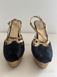 Sandali Miu Miu con plateau, taglia 40, colore oro e nero, altezza tacco 13 cm. Buone condizioni. No scatola. Per qualsiasi cosa contattatemi