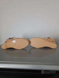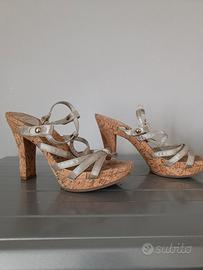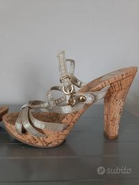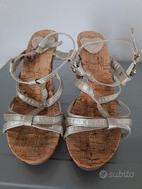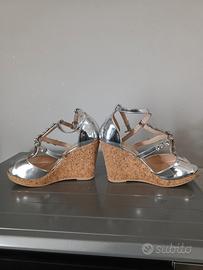 Coppia di sandali N*38: quelli argento con zeppa 10Cm usati 2 ore in sala da ballo. Quelli con tacco 10Cm usati 2 volte sempre per ballo. Zeppe e tacchi in sughero comodissimi. Design particolarmente accattivante. Vendesi in coppia.