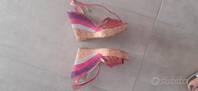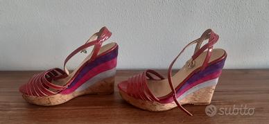 Sandali n. 34 in pelle lucida color rosa scuro con zeppa e tacco in sughero con inserti colorati in camoscio sul tacco. La zeppa è cm 3, il tacco cm 11. La parte anteriore presenta una leggera usura del sughero (visibile nella foto). Acquistati presso Quartieri Calzature. Lavorazione artigianale.