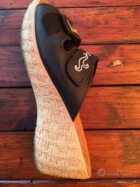Comodissimi ed eleganti sandali Fly Flot regolabili con velcro, in pelle blu, con decorazione ricamata, soletta in pelle, tacco cm.5, zeppa materiale sintetico, perfetti. Prezzo trattabile.