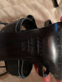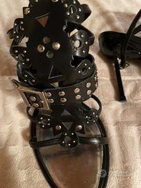 Eleganti sandali neri firmati Baldinini, realizzati in vero cuoio con dettagli traforati, borchie e cinturino decorativo. Design originale e sofisticato. Punta affusolata e tacco sottile. Made in Italy, taglia 38½.