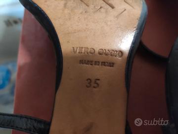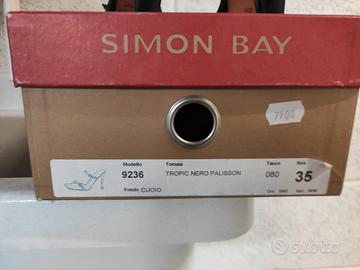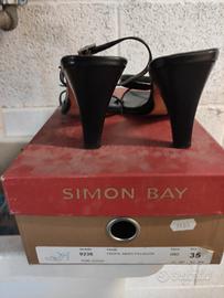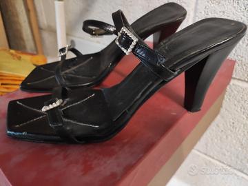 Sandali neri con tacco 8, fondo cuoio , due lacci con fibbie con strass . Marca Simon Bay