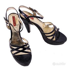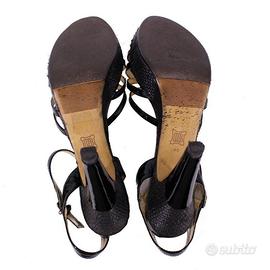 Sandali in vernice nera di Laura Biagiotti n. 40 usati. Tacco grosso e alto 12 cm. Presentano una serie di listarelle incrociate davanti, e sono chiusi da un laccetto alla caviglia. Anche con il tacco alto, sono comunque molto comode e portabili. Vendo con la scatola originale.