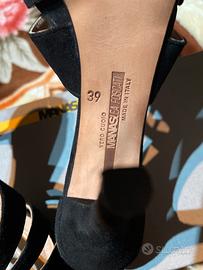 Sandali neri in suede, marca Manas acquistati in negozio a Riccione, indossati una volta. Taglia39 regolare. (Anche se con tacco alto hanno la zeppa e sono comodi), molto femminili.