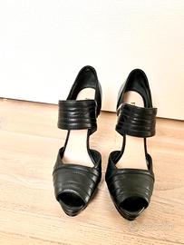 Due fasce con impunture decorative e inserì di elastico su quella alta per adattarsi ai vari piedi. Chic, eleganti, moderne. In condizioni perfette, come nuove e tacchi appena rifatti nuovi. Taglia 37 ma io porto un 37,5/38 e mi stanno giuste.