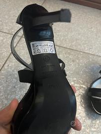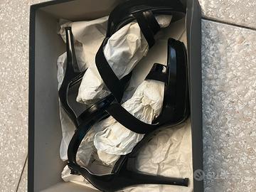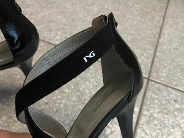 Bellissimi sandali NeroGiardini originali, realizzati in un elegante mix di materiali che unisce la ricercatezza della pelle Napluk (pelle lucida dall’effetto leggermente increspato/vintage) e la morbidezza dei listini scamosciati. • Marca: NeroGiardini (Made in Italy) • Taglia: 39 (calzata regolare/comoda tipica del brand) • Colore: Nero • Materiale: Pelle Napluk e dettagli in camoscio • Altezza Tacco: Circa 10 cm • Plateau: Presente, per garantire maggiore comfort nonostante l'altezza • Dettagli: Logo metallico "NG" laterale cromato; chiusura con zip posteriore per una calzata pratica e veloce. Stato dell'articolo: Le scarpe sono in ottime condizioni (come visibile dalle foto). La struttura è integra e il tacco è stabile.