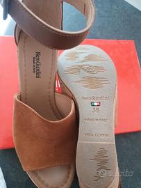 Sandali in pelle con zeppa e cinturino alla caviglia Nota marca • Chiusura regolabile con fibbia e pence elastica • Modello con tallone coperto • Altezza zeppa 10 cm • Altezza plateau 3 cm • Tomaia in pelle scamosciata • Plantare imbottito in pelle • Suola in sughero • Fondo in gomma antiscivolo Indossati un paio d'ore solamente NR 36